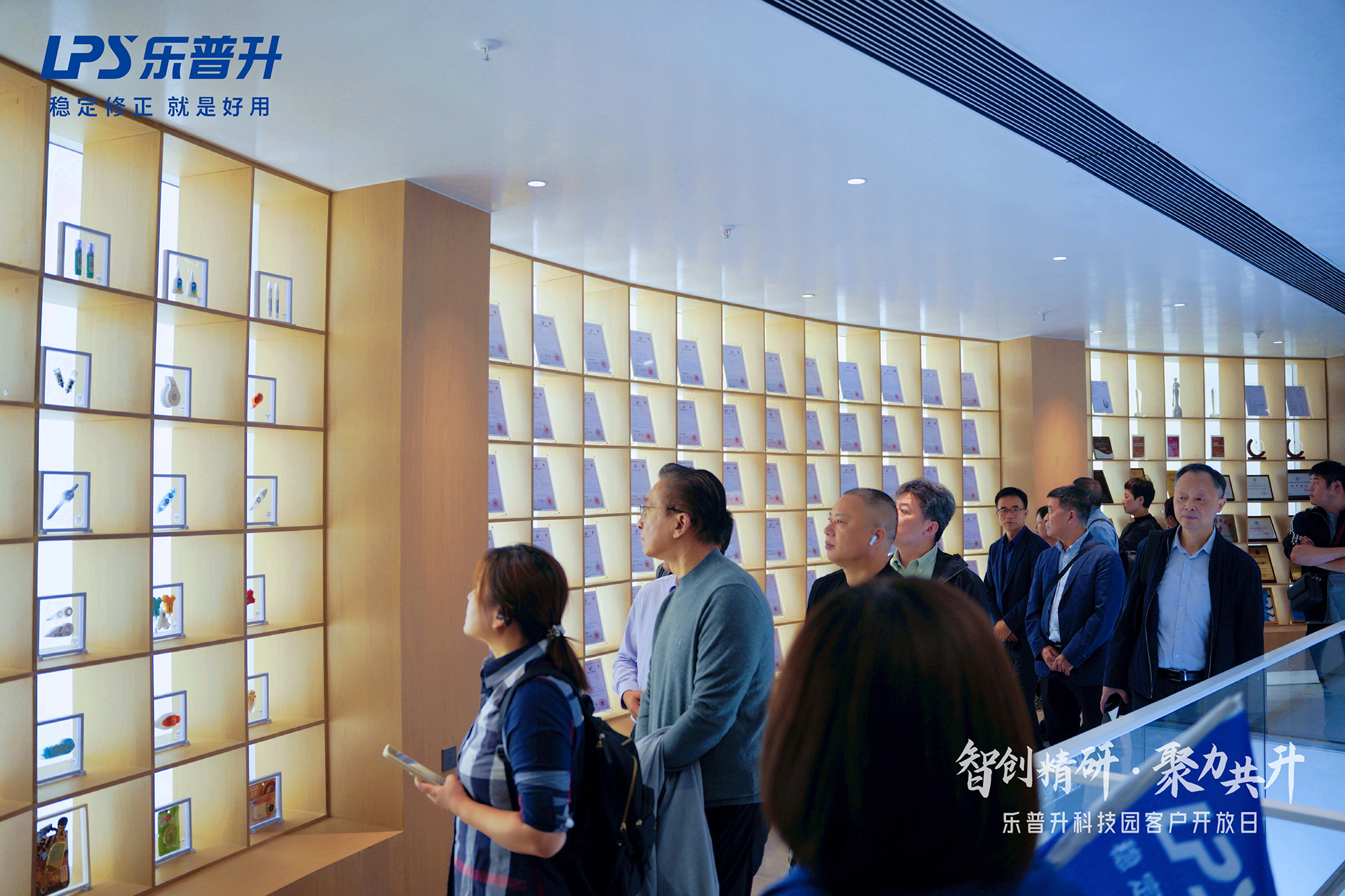 随后,在讲解员的引导下依次参观了企业30年历程墙、荣誉墙、专利展示墙和明星产品展示墙。斑驳的老照片与崭新的奖杯牌匾相映成趣,见证了乐普升从一家小公司成长为行业翘楚的奋斗历程。
