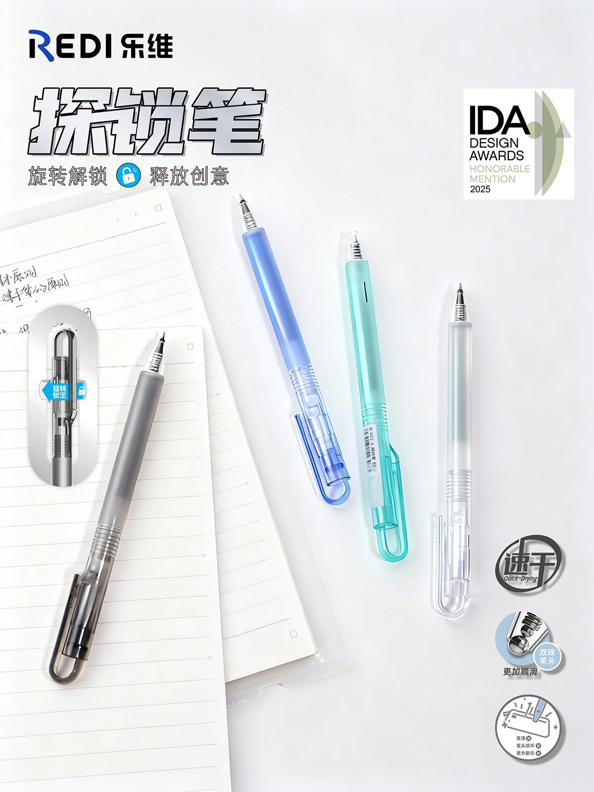 亮眼表现的背后,是乐普升在设计领域的持续深耕。近年来,公司设计成果斐然,旗下笔式修正带、时空UFO修正带及REDI乐维系列中性笔等产品,屡获红点奖、iF设计奖、缪斯设计奖等国际权威奖项认可,持续引领行业美学与功能创新的风潮,展现出强劲的品牌活力。