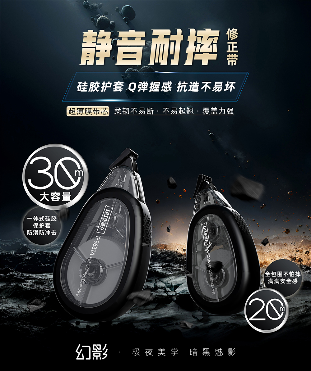 乐普升全新推出「幻影」系列静音耐摔修正带,以极夜美学为灵感,