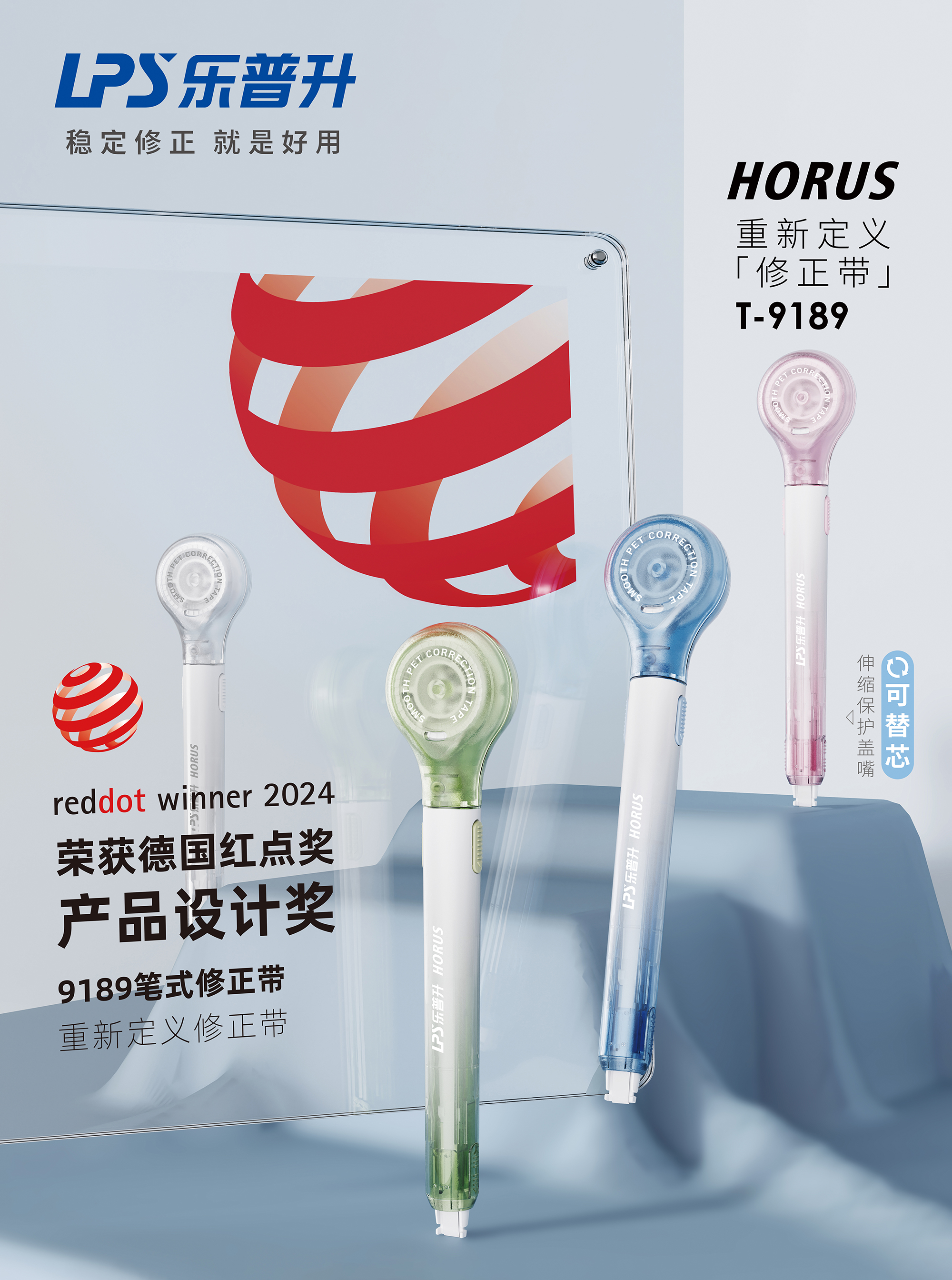 从荣获德国红点奖的乐普升9189笔式修正带,
